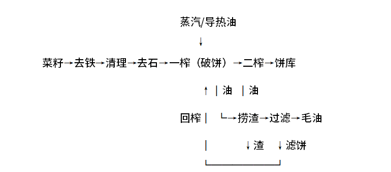 菜籽经永磁筒,去除铁杂后,进入清理筛去除秸秆、大杂、尘土,经去石机去除石子,然后进入一榨机直接压榨,一榨饼破碎后进入二榨机压榨,二榨饼经输送设备送入饼库;油、渣经油渣分离刮板进入澄油箱沉淀,渣捞出后送至榨油机回榨,油溢流至毛油箱,经油泵送入过滤机过滤,过滤后的毛油经泵送入到炼油车间精炼。