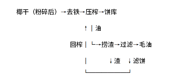 椰干(粉碎后)经永磁筒,去除铁杂,直接进入榨油机压榨,压榨后的饼经输送设备送入饼库;油、渣经油渣分离刮板进入澄油箱沉淀,渣捞出后送至榨油机回榨,油溢流至毛油箱,经油泵送入过滤机过滤,过滤后的毛油经泵送入到炼油车间精炼。