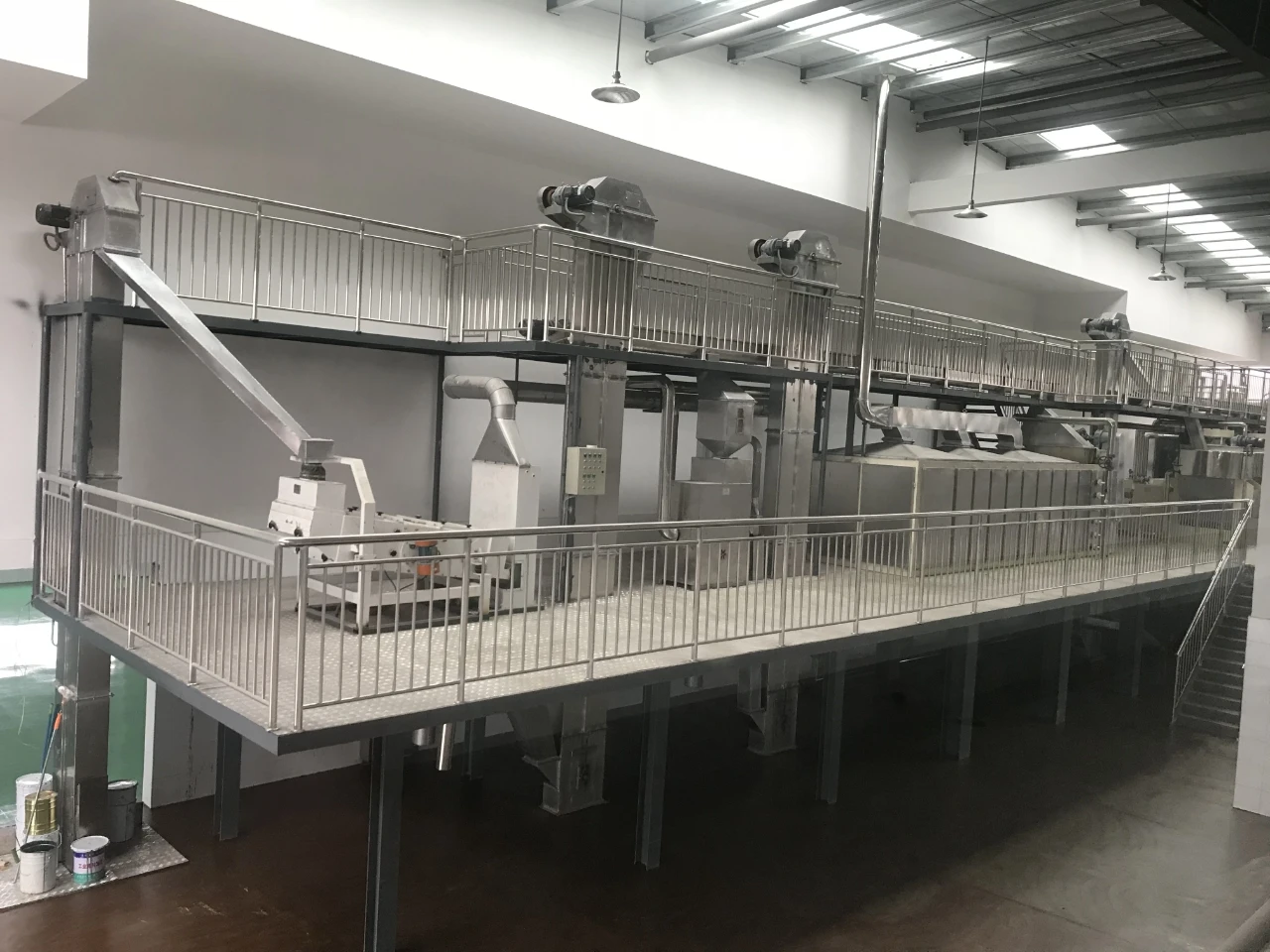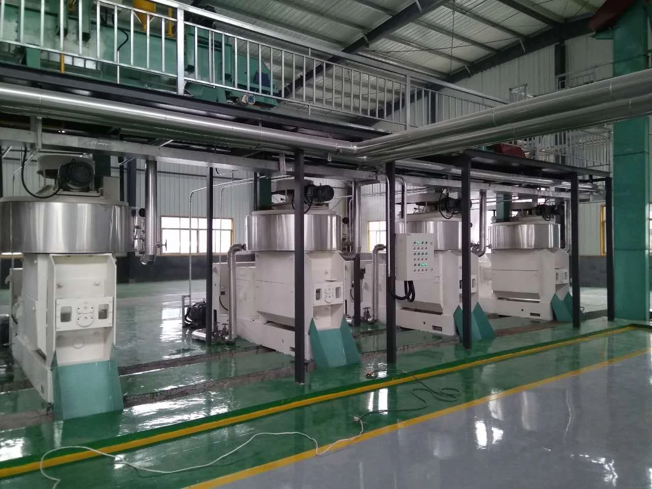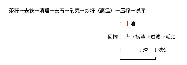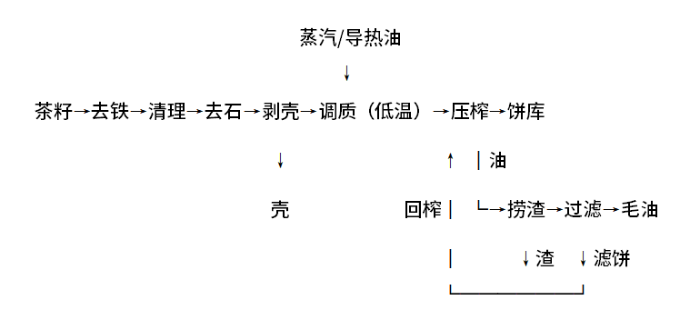 茶籽经永磁筒,去除铁杂后,进入清理筛去除秸秆、大杂、尘土,经去石机去除石子,然后进入专用剥壳机剥壳,剥壳后茶籽进入调质锅,调整到合适水分进入榨油机压榨,压榨后的饼经输送设备送入饼库;油、渣经油渣分离刮板进入澄油箱沉淀,渣捞出后送至榨油机回榨,油溢流至毛油箱,经油泵送入过滤机过滤,过滤后的毛油经泵送入到炼油车间精炼。