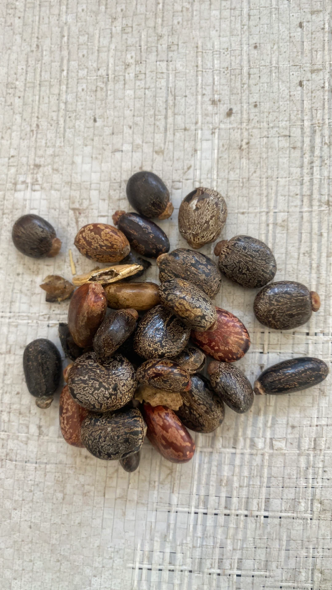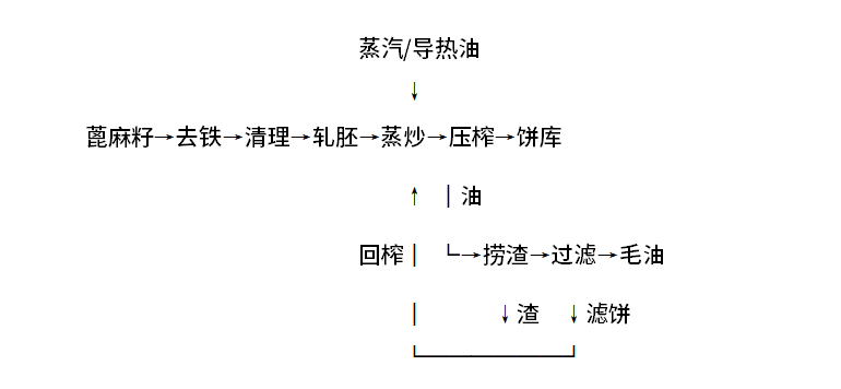 蓖麻籽经永磁筒,去除铁杂后,进入清理筛去除秸秆、大杂、尘土,然后进入轧胚机轧胚,胚料进入调质锅,调整到合适水分进入榨油机压榨,压榨后的饼经输送设备送入饼库;油、渣经油渣分离刮板进入澄油箱沉淀,渣捞出后送至榨油机回榨,油溢流至毛油箱,经油泵送入过滤机过滤,过滤后的毛油经泵送入到炼油车间精炼。
