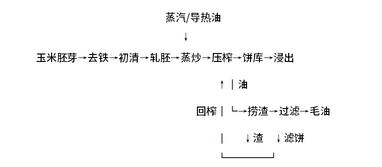 玉米胚芽经永磁筒,去除铁杂后,进入清理筛去除秸秆、大杂、尘土,然后进入轧胚机轧胚,胚片进入蒸炒锅调整到合适水分进入榨油机压榨,压榨后的饼经输送设备送入浸出车间;油、渣经油渣分离刮板进入澄油箱沉淀,渣捞出后送至榨油机回榨,油溢流至毛油箱,经油泵送入过滤机过滤,过滤后的毛油经泵送入到炼油车间精炼。