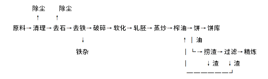 由榨油机出来的含渣油经油渣分离刮板送入澄油箱进行沉淀、捞渣后,混合油经油泵打入过滤机过滤,浊油回滤,清油流入油箱由油泵经计量后送往精炼车间或油库。由澄油箱捞出的渣和过滤机排出的滤渣一起经油渣分离刮板、回渣绞龙送至刮板输送机,同料坯混合后再去榨油机回榨。饼送至饼库。
