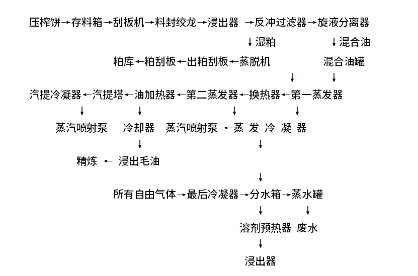 从榨油车间送来的饼块由进料刮板输送机送入浸出器料封绞龙,进入浸出器,物料在浸出器中由进料口到出料口环行一周,经浓度递减的混合油喷淋、浸泡后,最后用新鲜溶剂喷淋,经过一段滴干区沥干,被连续地送出浸出器进入湿粕刮板。最浓的混合油由浓混合油泵打入旋液分离器除杂后进入混合油罐暂存。