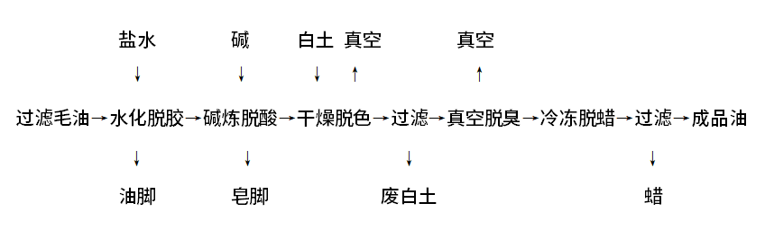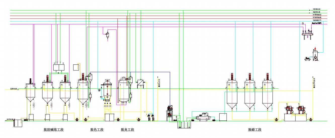 精炼系统由炼油锅、脱色干燥锅、脱臭锅、皂脚锅、结晶罐、过滤机、导热油炉、真空系统、冷冻机组等设备组成。毛油经过脱胶、脱酸、脱色、脱蜡、脱臭等工艺过程可获得1-4级油。