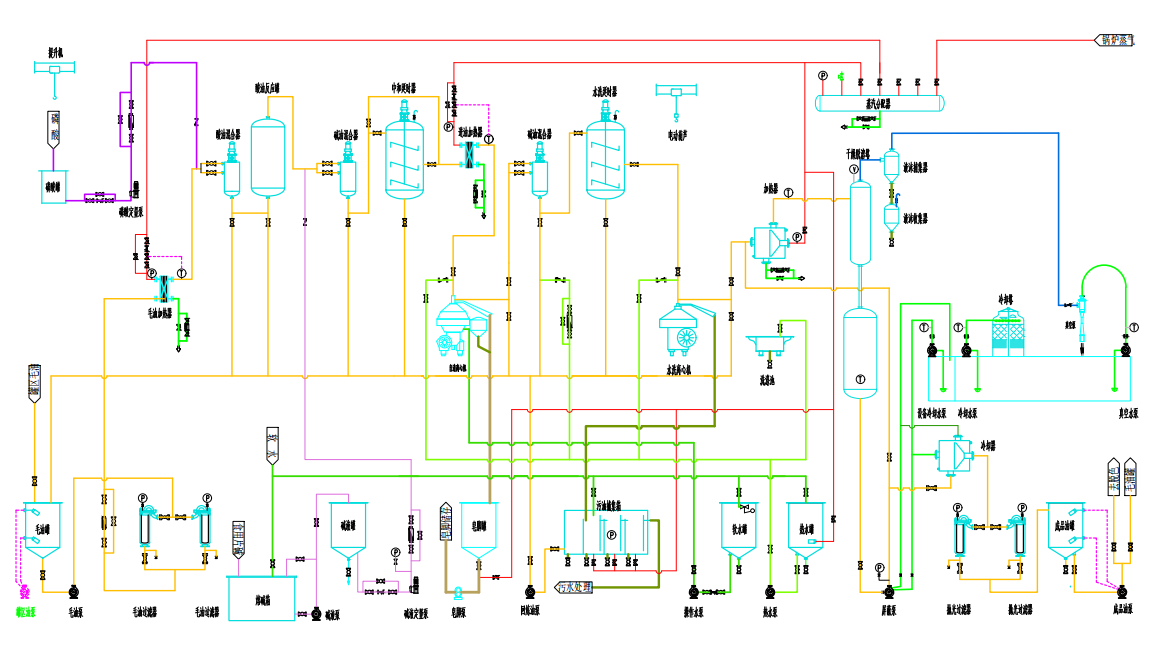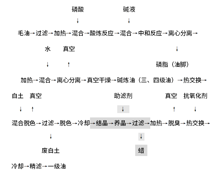 精炼系统由炼油锅、脱色干燥锅、脱臭锅、皂脚锅、结晶罐、过滤机、导热油炉、真空系统、冷冻机组等设备组成。毛油经过脱胶、脱酸、脱色、脱蜡、脱臭等工艺过程可获得1-4级油。