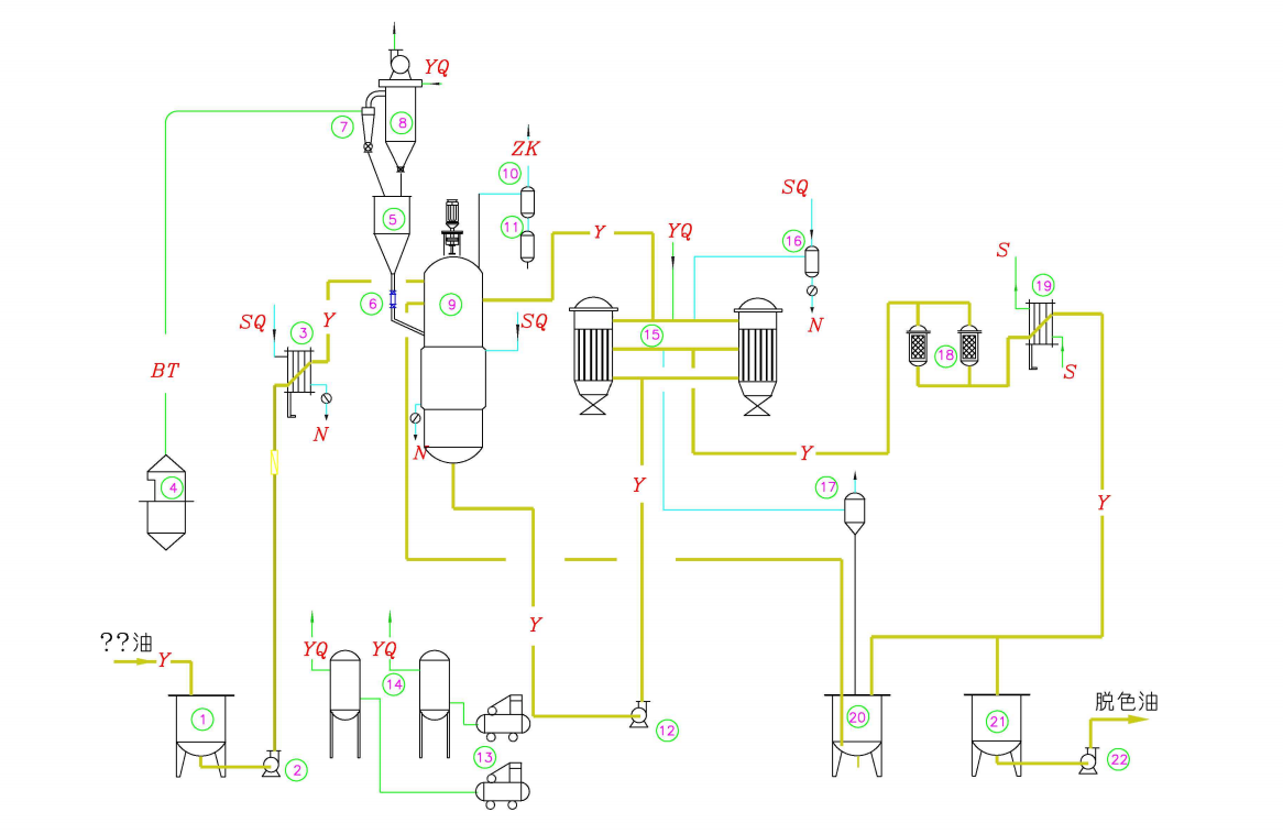 脱色是从油中去除有色物的过程,通常是将油与适量脱色白土混合,可以吸附油中的有色物质并在过滤时与油分离。脱色白土储存在投料斗中,经气力输送系统进入到白土日罐中,位于白土日罐上方的脉冲除尘器及除尘风机将空气净化后排入大气。