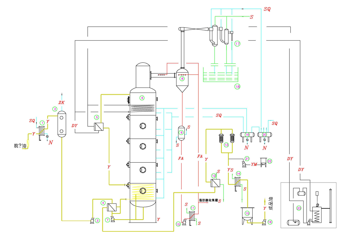脱色油经过精过滤机过滤后进入一个缓冲罐。缓冲罐在真空的条件下工作,并且在油脂在进入缓冲罐的时候被喷雾装置变成雾状以脱除油脂中溶解的微量的氧气。从缓冲罐出来的油在真空节能器中与从脱臭塔来的油换热后,再用高压水蒸气加热后进入脱臭塔进行脱臭反应。脱臭塔为填料式组合塔,它由三个部分组成:顶部为脂肪酸捕集段,用于蒸馏出脂肪酸的捕集;中部为填料汽提段,装有结构填料,用于脱臭脂肪酸蒸馏和臭味物质脱除;下部为热脱色保持段,用于热敏色素的分解去除。油进入脱臭塔,分配到塔的横截面的各个部分。油滴流入填料层并在巨大的填料表面形成一层薄膜。在填料层内油与气提蒸汽逆流接触,挥发物质:如游离脂肪酸、各种异味物质在真空和气提蒸汽的组合作用下被脱除掉。与传统的托盘系统比较填料层内逆流传质方式的大大地减少了直接蒸汽的 消耗用量。气提后油从气提段进入保持塔盘,在这里通入一定量的气提蒸汽。在保持段一些热敏物质通过热反应被裂解并达到脱色的目的。同时各种不稳定的氧化物被破坏从而使最终脱嗅油脂更稳定。热脱色地保持时间可以根据油的流量和实际需要随时调整或锁定固定时间。脱臭后的热油经过节能器回收热量,并且冷却到 60℃以下就得到了精炼成品油。